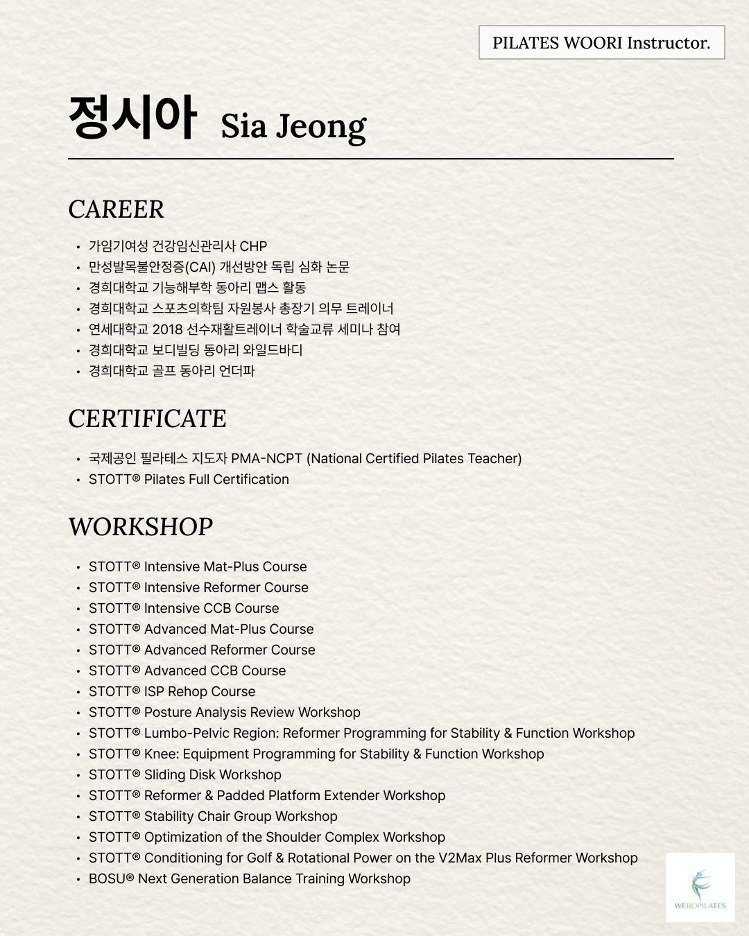 과정 목표: 깊이 있는 이론과 완벽한 동작 수행 능력을 바탕으로, 자신만의 스튜디오를 창업할 수 있는 '마스터 레벨' 지도자 양성.